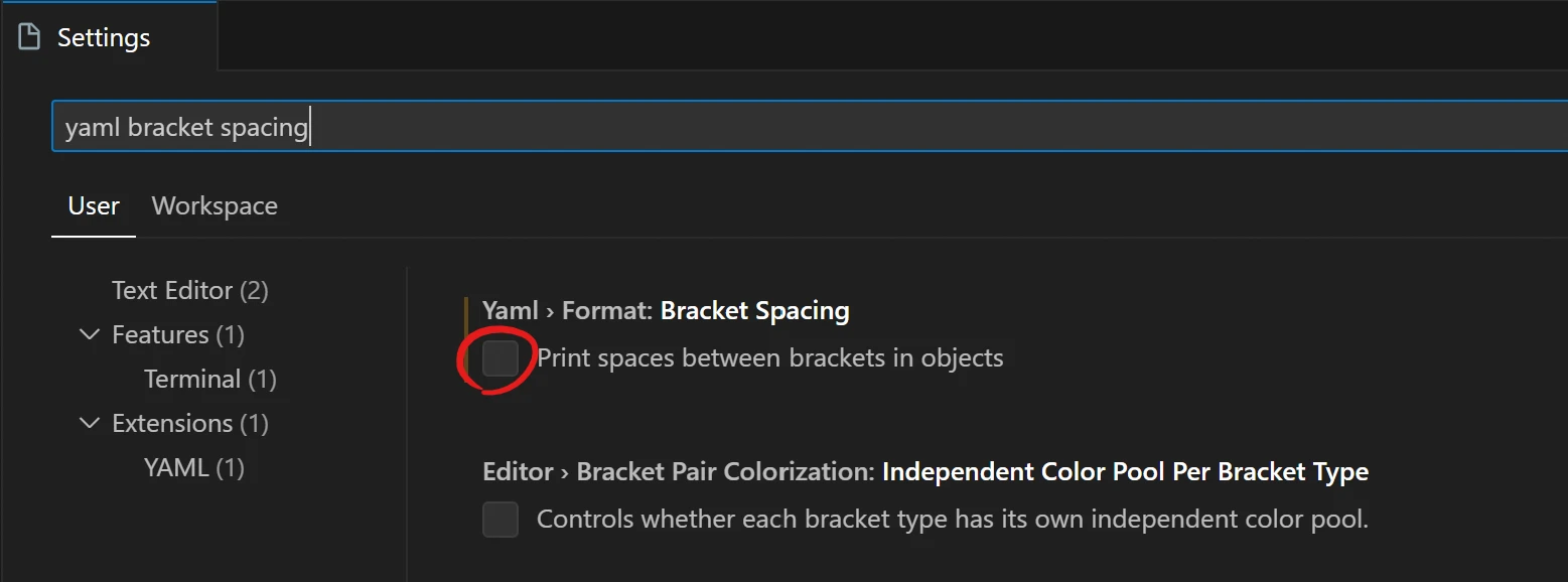 为此可以在 vscode 全局设置中将 Yaml 的 Format: Bracket Spacing 取消勾选.