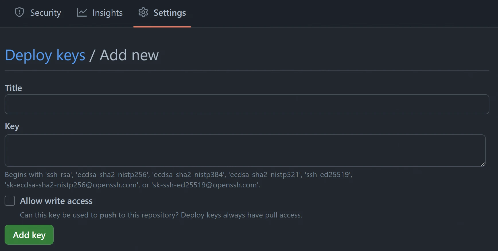 我们可以在代码仓库的 Settings / Deploy Keys 页面中配置 (ssh 公钥):