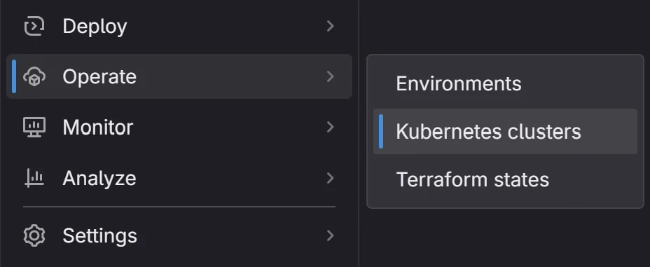 打开代码仓库的 Operate / Kubernetes clusters 页面: