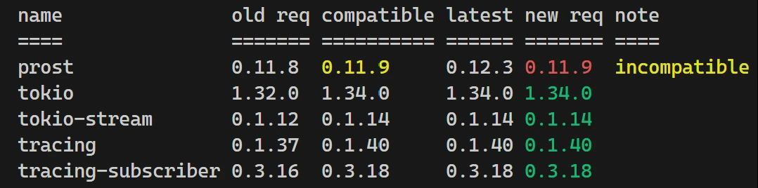 cargo upgrade -i # 短选项可以看到下图中的 prost 更新至了 0.11.9, 并未更新至最新的 0.12.3.