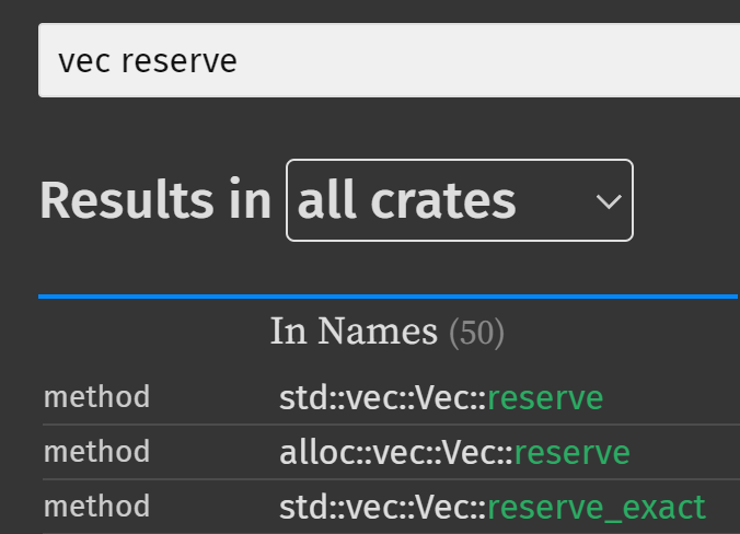 例如希望搜索 std::vec::Vec::reserve(), 就可以输入关键词 vec reserve.