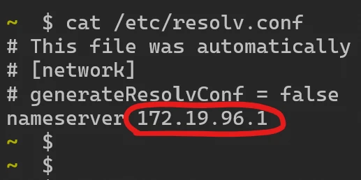 通过 WSL 中的 /etc/resolv.conf 文件得知宿主系统的 IP 地址: