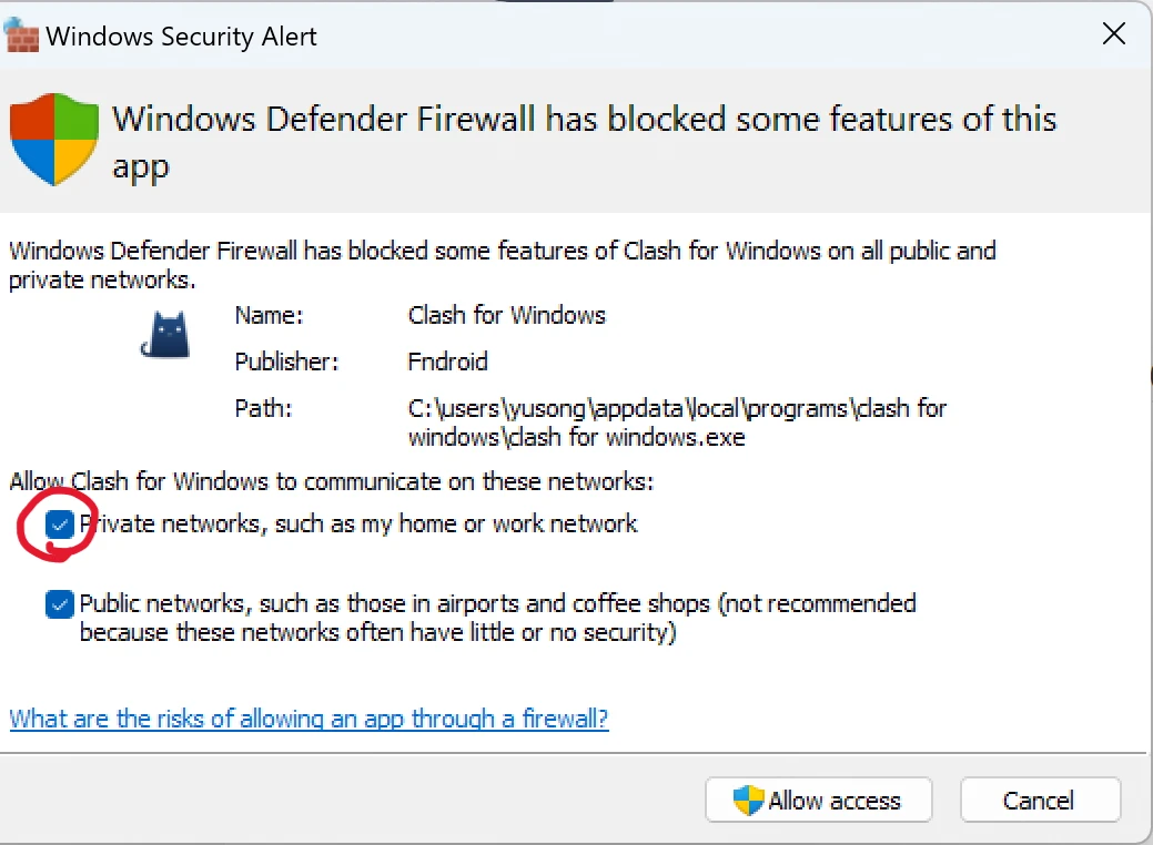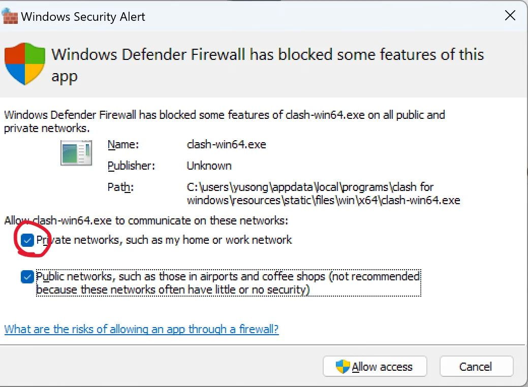 首次运行 clash 时, 会触发以下两个弹窗, 注意勾选 Private networks.