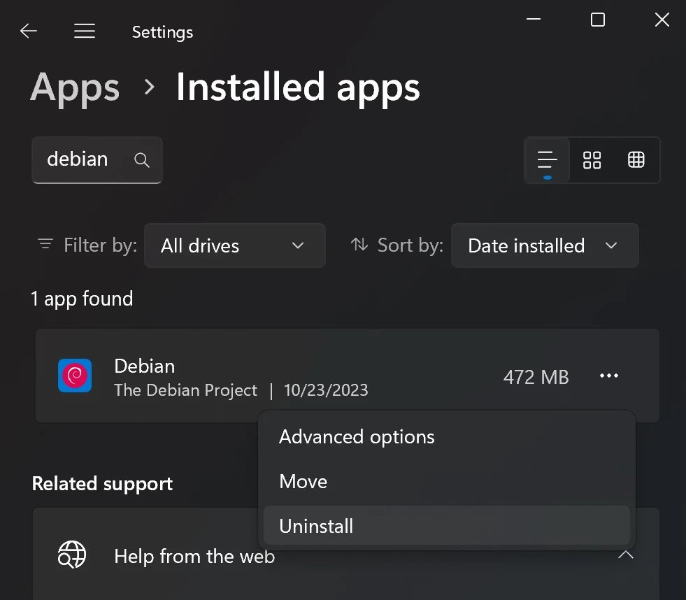 wsl --unregister [distribution-name] # 删除指定发行版先执行以上命令, 再通过 Windows 默认的软件卸载方案移除.