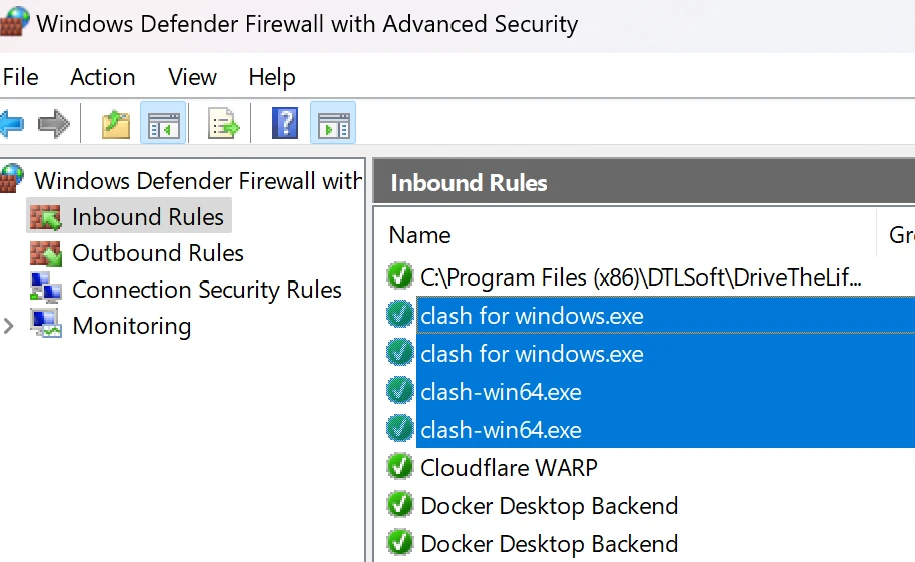 通过查看 Windows Defender Firewall, 如果发现 clash 相关进程的图标是红色,