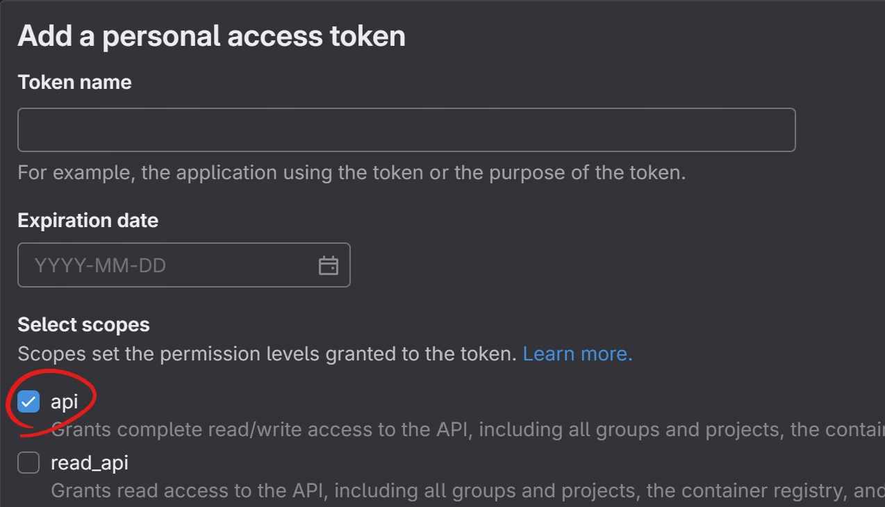 在开始配置前, 需要在 GitLab 中创建 Personal Access Token.