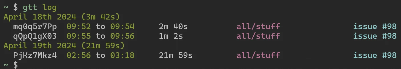 gtt start时, 没有检测 repo 或 issue 是否存在 (缺少防呆设计).gtt log的排版不整齐 (持续时间小于和大于 1 小时的 log 没有对齐).- 无法在操作系统 UI 界面 (例如任务栏) 中得知当前是否在追踪.