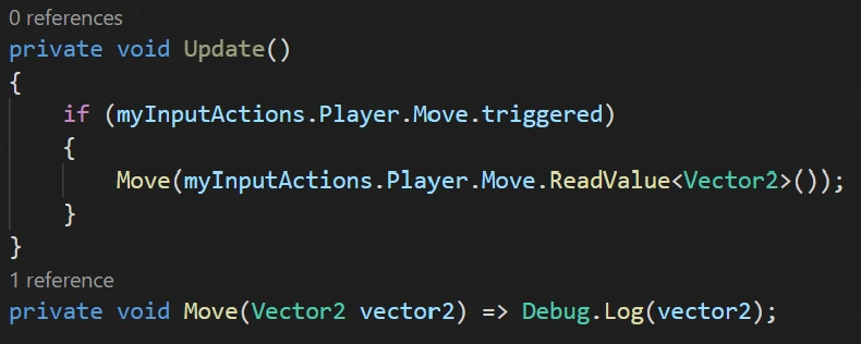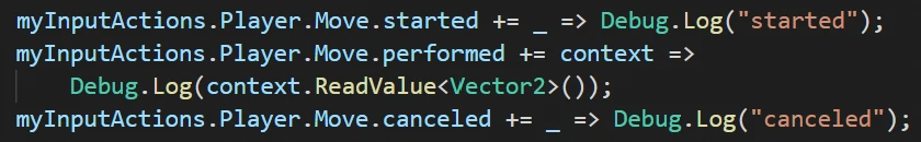 myInputActions.Player.Move.performed += context => Debug.Log(context.ReadValue<Vector2>());