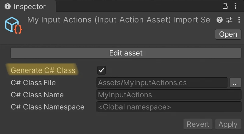 选中 Input Actions asset 后, 在 Inspector 中勾选 Generate C# Class.