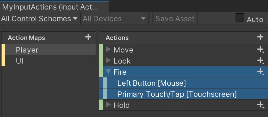 例如下图 Fire 这个输入行为绑定了两个输入方式, 一个需要鼠标, 一个需要触屏.