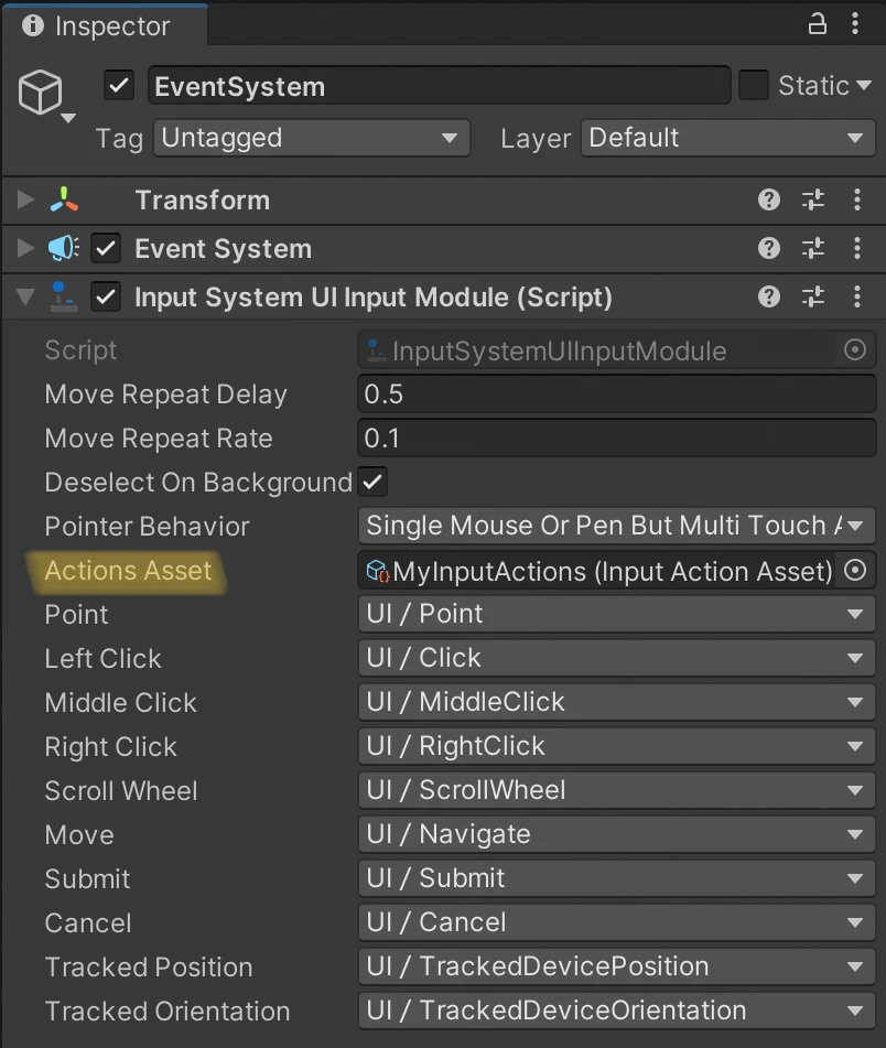注意 Actions Asset 所引用的 asset, 默认为 Input System Package 中自带的.