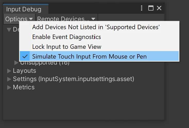 点击Options, 开启Simulate Touch Input From Mouse or Pen.