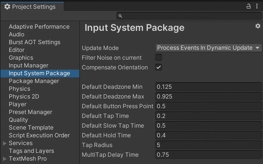 在 Project Settings > Input System Package 中可以对全局参数做配置.