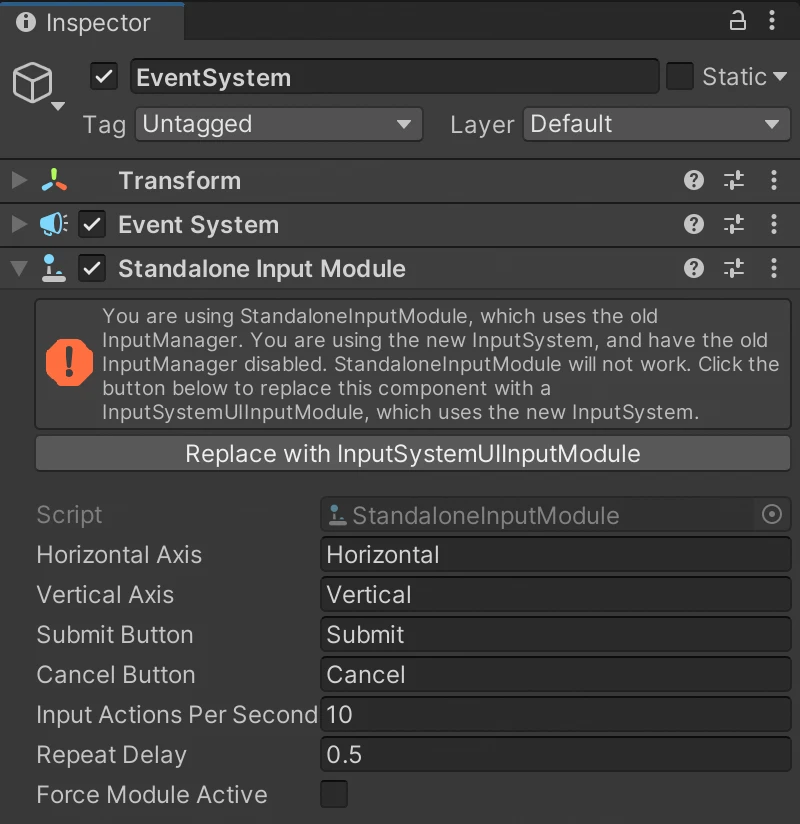 点击 Replace with InputSystemUIInputModule 按钮, 即可替换成 Input System 对应的组件.