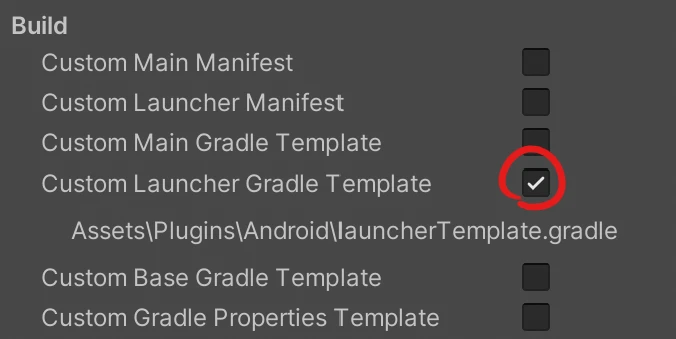 因此当需要使用 Unity Editor 按钮来构建时, 不勾选 Custom Launcher Gradle Template.
