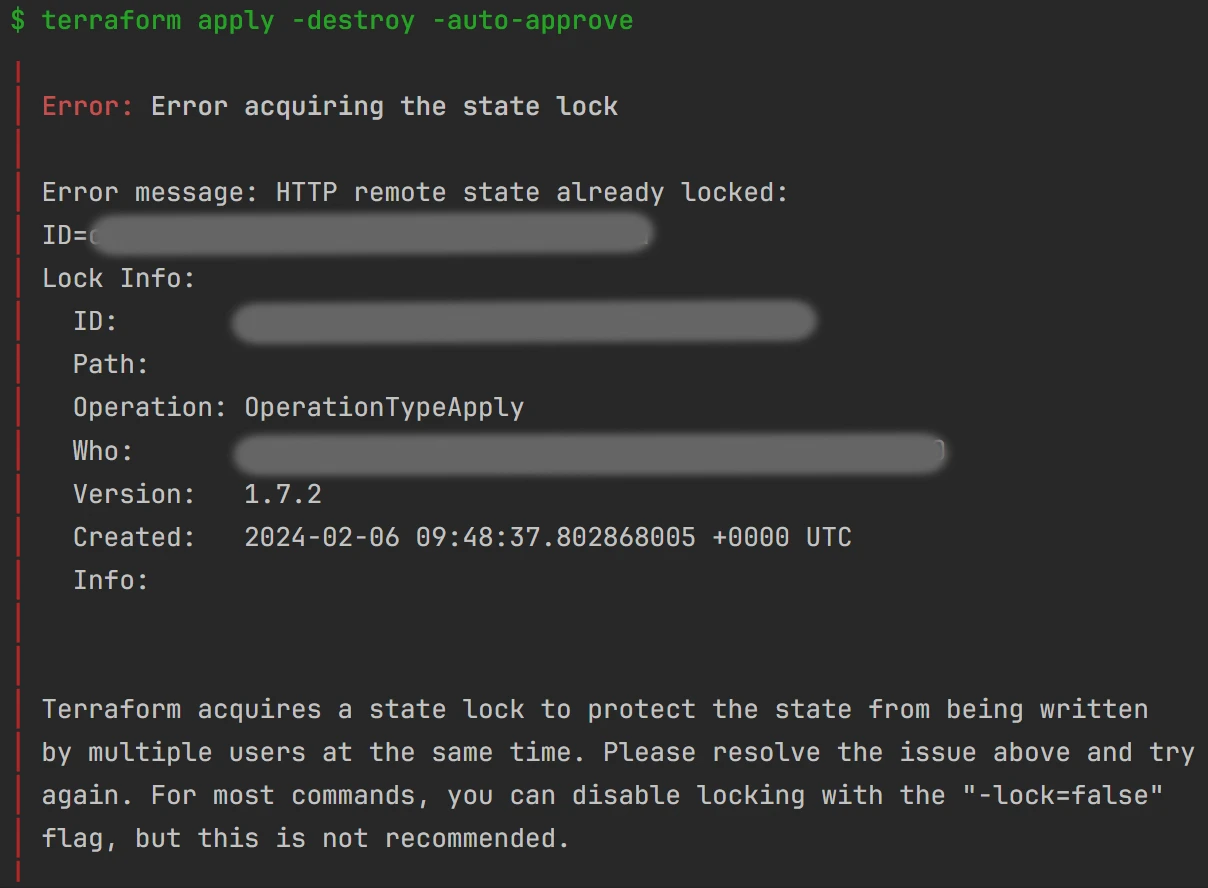 在调用 terraform apply 或 terraform destroy 命令时, 可能会遇到此问题: